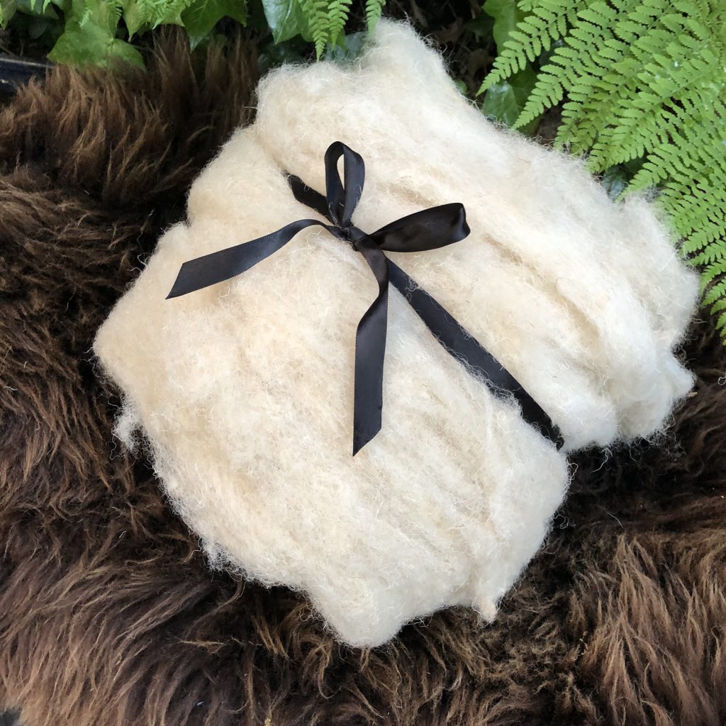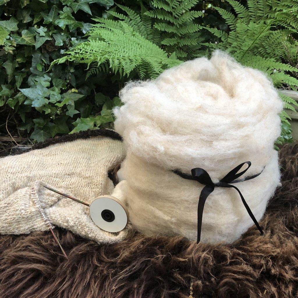 During the summer months I prepared several batches of 200 g natural, hand washed & carded fleece of the Badger Face Welsh Mountain Sheep. This historic British sheep breed comes in two distinct colors: The Torddu, with a white body with a dark face mask and black belly stripe, reaching from the chin to end of the tail. And the Torwen, which has a dark body and a white belly stripe. All fleeces came from Torddu, naturally colored white/off white and beige, with a medium staple length of 37-28 micron. As with most mountain sheep, there is some kemp, but the fiber feels sturdy and warm with spinning and knitting.